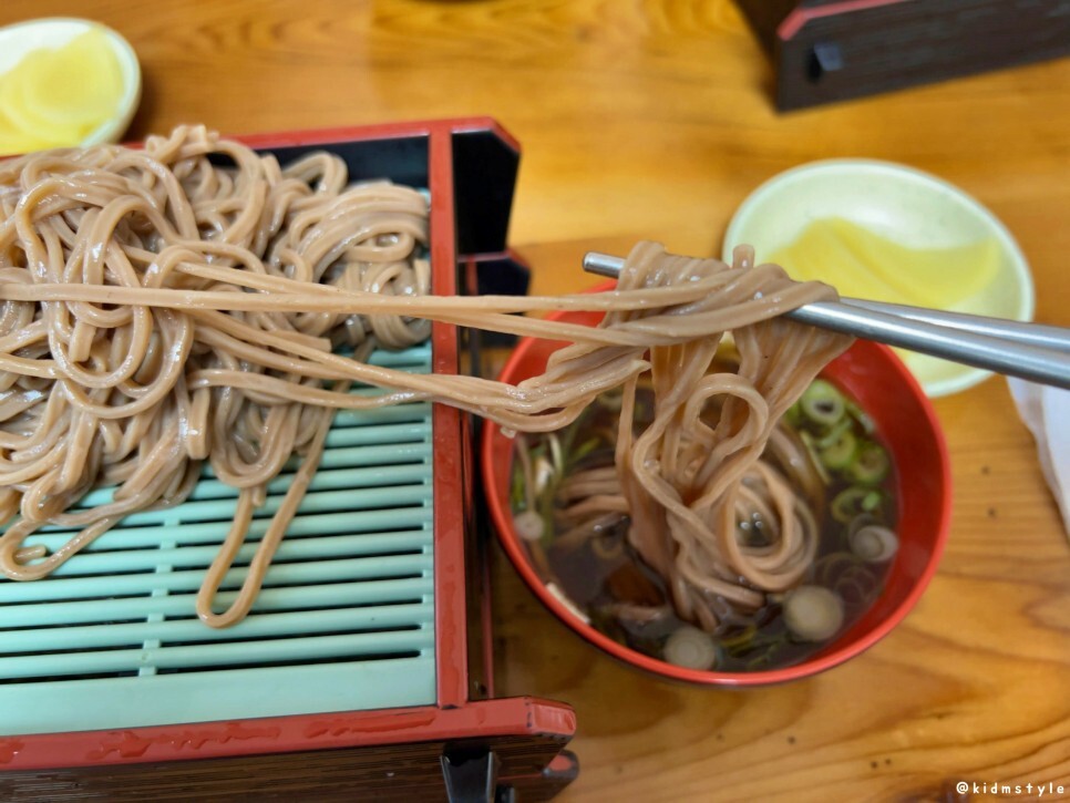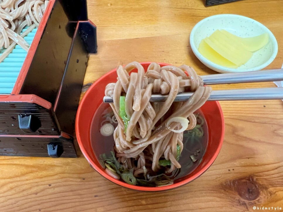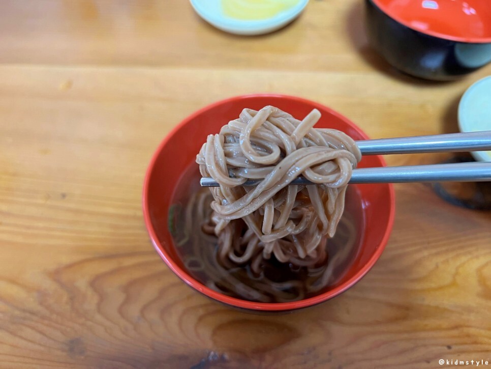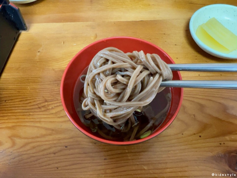 면을 보니 잘 삶아놨다는 게 눈으로 느껴진다. 면발에 탄력이 있고 탱글탱글한데 메밀 함량이 낮아서 메밀가루 특유의 꺼끌꺼끌함이 덜한 편이다.