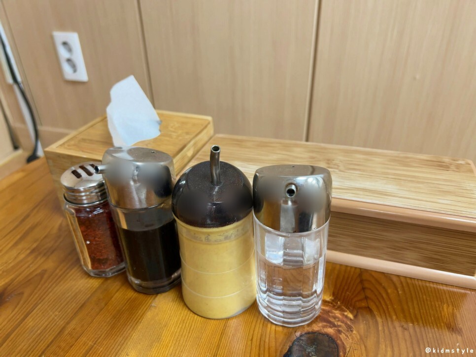 고춧가루, 간장, 겨자, 식초는 테이블에 준비되어 있다.
