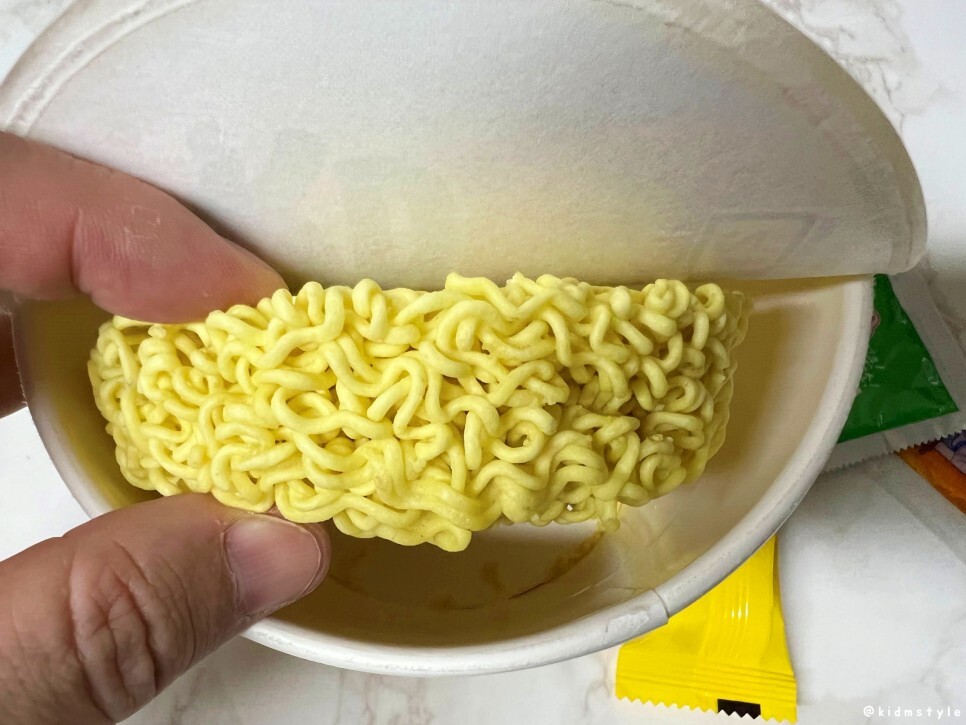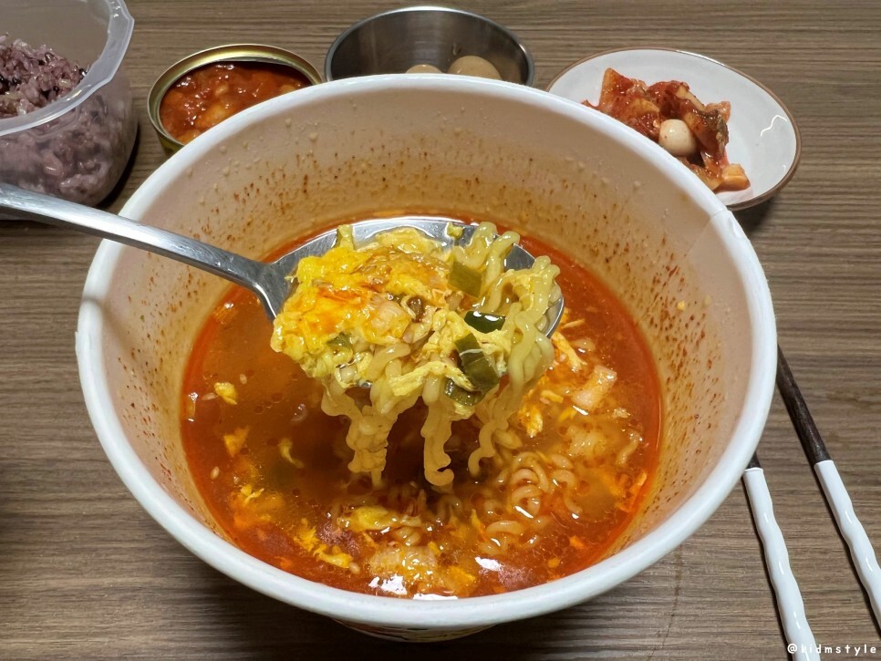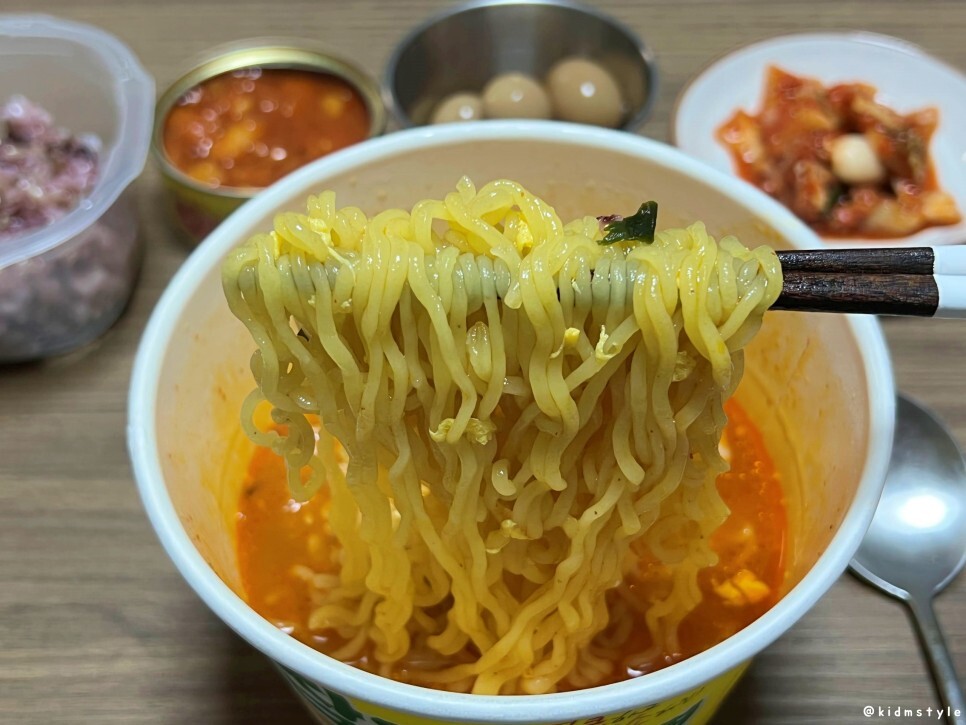 면발은 꽤 꼬들꼬들하고 맛이 괜찮다. 큰컵 컵라면 치고 면발이 굵지 않고 약간 얇은 편이라 참 마음에 든다.