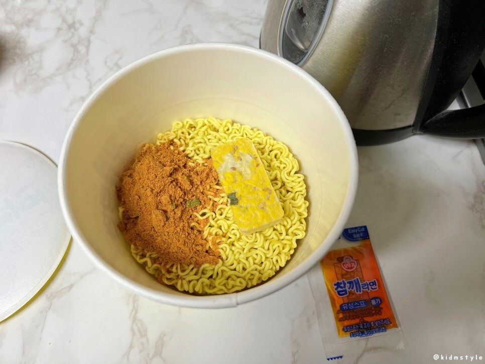 참깨라면의 포인트인 계란블럭과 유성스프를 넣었다.