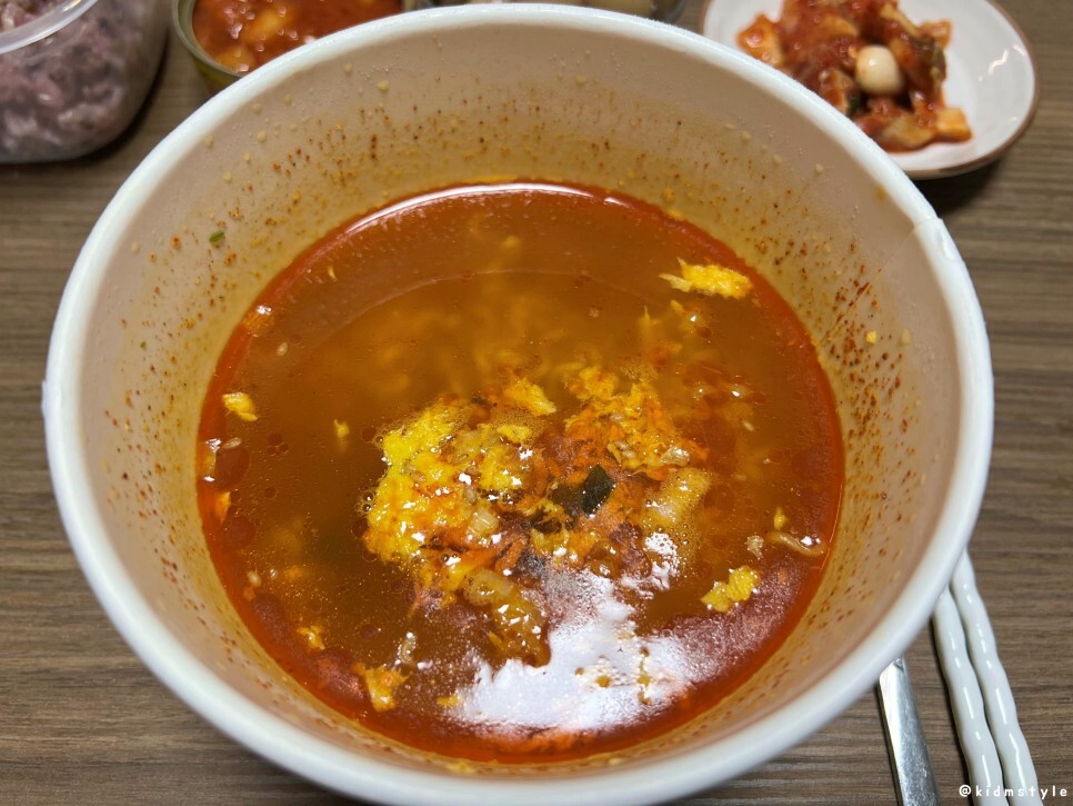 국물에 기름이 둥둥 뜨는데 조미 참기름이라 매콤하면서 고소하다.