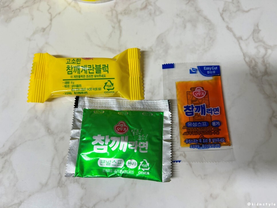 스프는 총 3가지이다. 참깨라면 분발스프, 고소한 참깨계란블럭, 유성스프 등