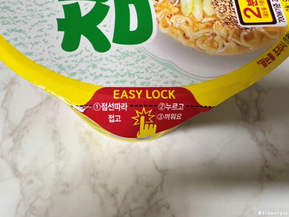 끓는 물을 붓고 점선을 따라 접고 누르고 끼우면 뚜껑을 고정할 수 있는 EASY LOCK