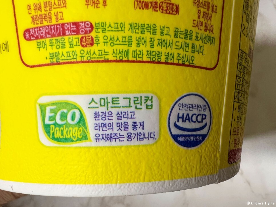 스마트 그린컵이다. 이런 용기로 바뀌어서 좋다. 환경은 살리고 라면의 맛을 좋게 유지해 주는 용기이다.
