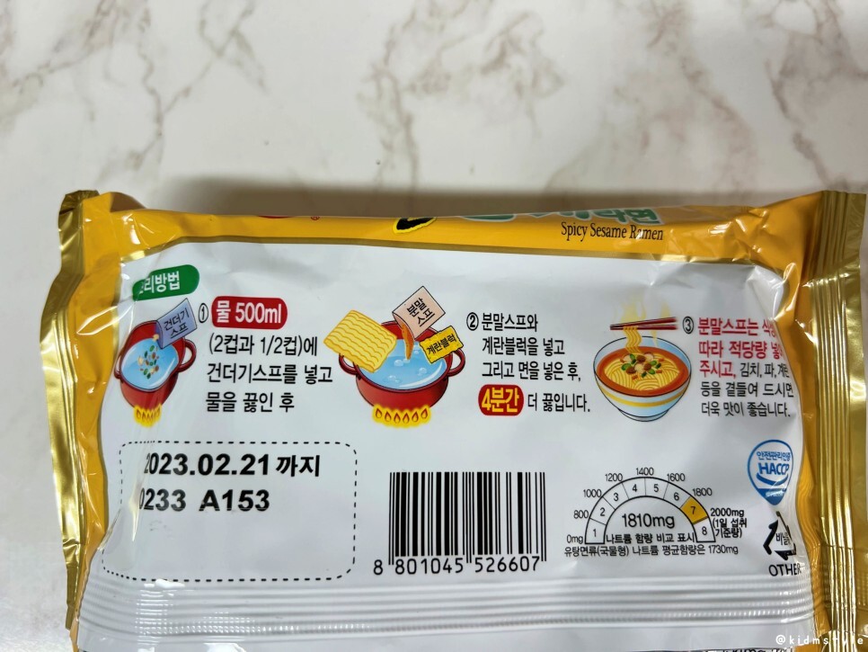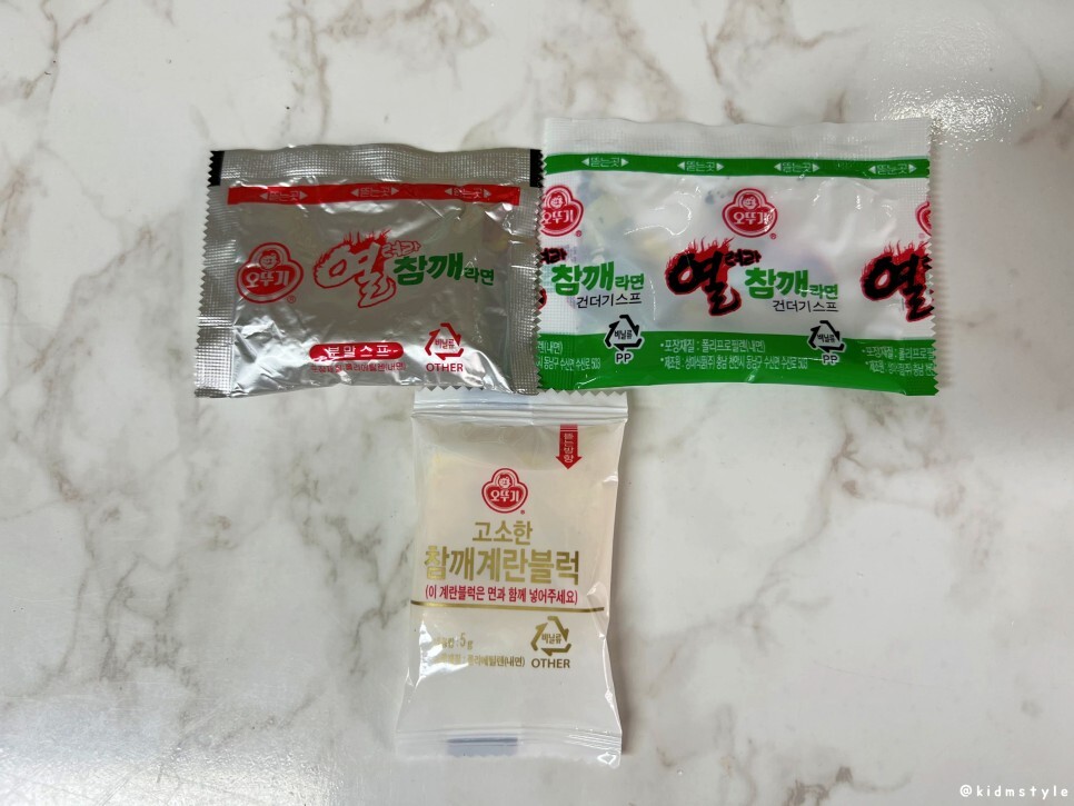 스프는 총 3가지인데 분말스프, 건더기스프, 고소한 참깨 계란블럭이 들어가 있다.