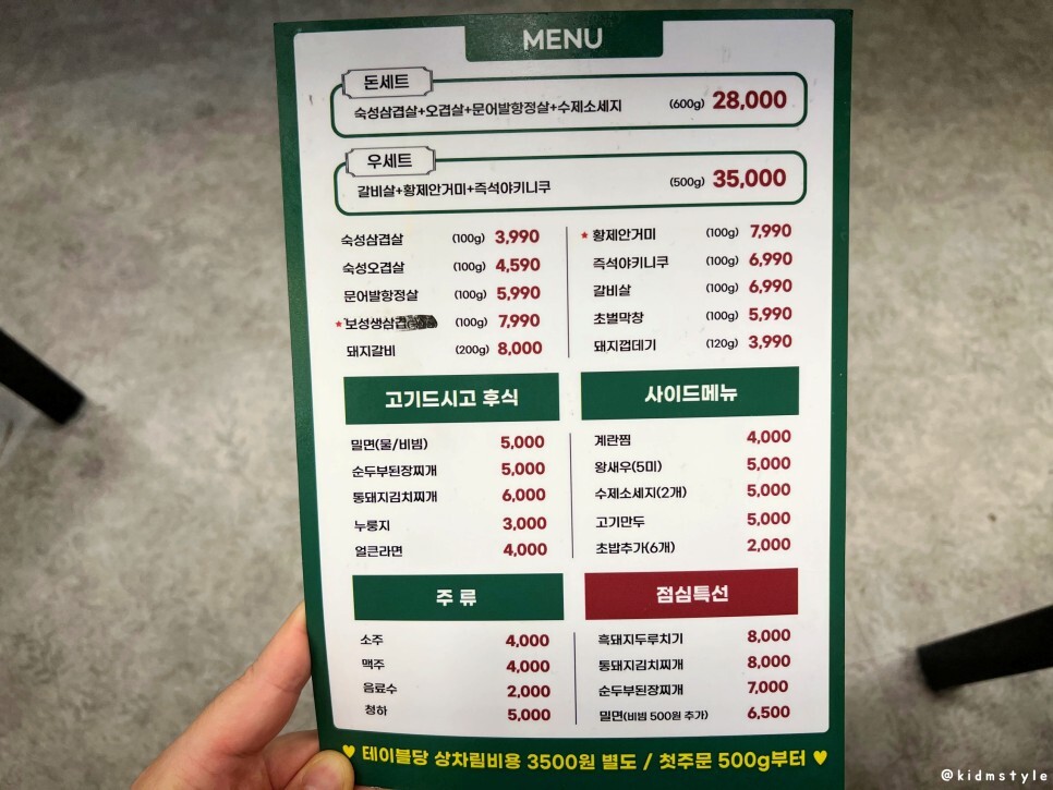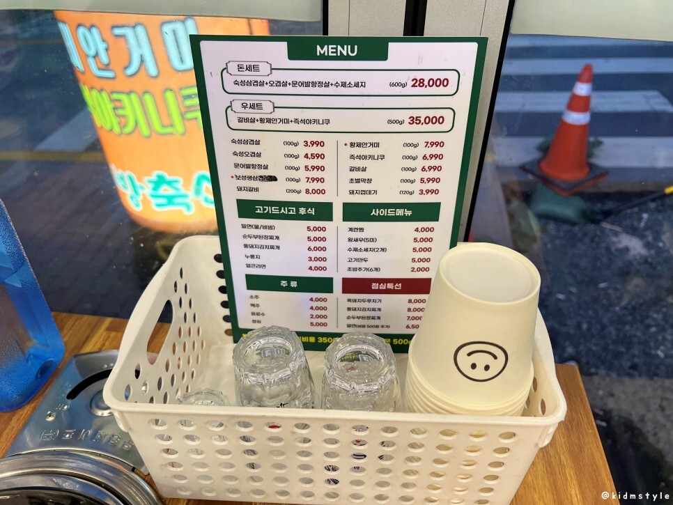 테이블 당 상차림 비용이 3,500원 발생하며 기본 주문은 500g이고 두 번째 주문은 200g부터이다. 삼겹살, 오겹살, 돼지갈비, 항정살, 돼지막창, 야키니쿠, 안거미 등 다양한 메뉴가 있으며 세트메뉴도 있다. 점심 메뉴가 있어서 점심때도 사람이 꽤 보이더라.