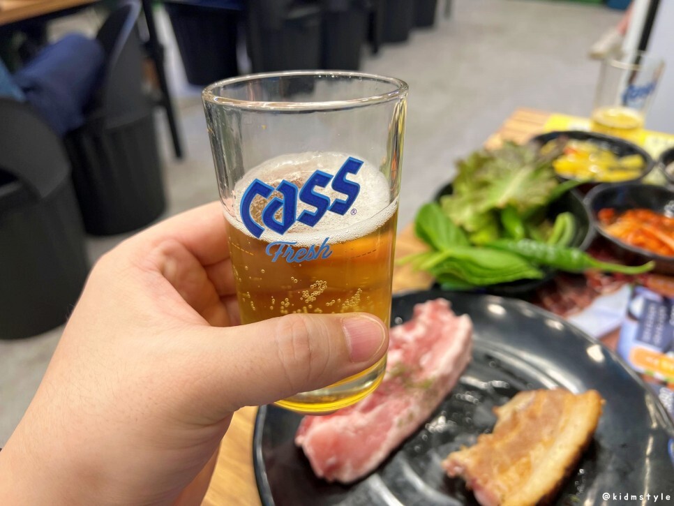 불판이 특이하다. 다른 테이블에서 불쇼를 하는 모습을 몇 번 보니 굽기 쉬운 불판은 아닌 것 같다. 하지만 어떤 불판을 갖다 놔도 집게 마스터인 본 블로거는 쉽게 구울 수가 있다. 집게 마스터의 실력이 궁금하다면 연락 바란다. 삼겹살에 소주 한잔 좋다.