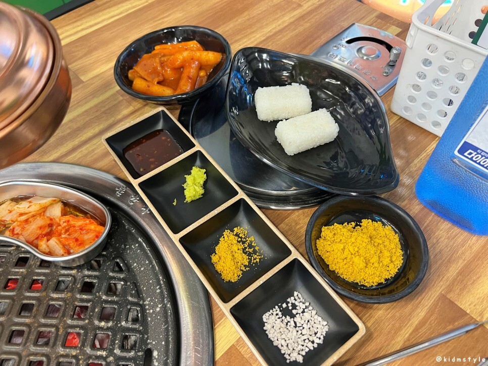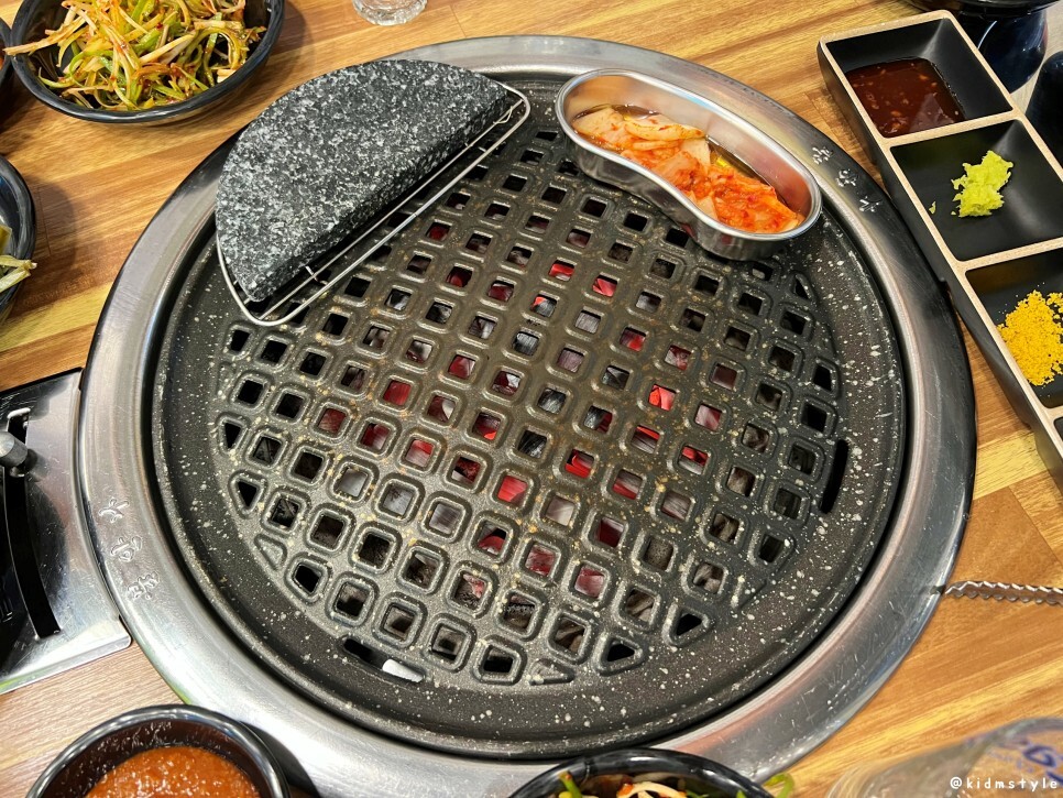 다 구운 고기를 올려놓을 수 있는 반달 모양의 작은 돌판도 있고 오른쪽에는 김치와 참기름을 부어서 별미로 맛볼 수 있는 작은 종지도 올려준다.