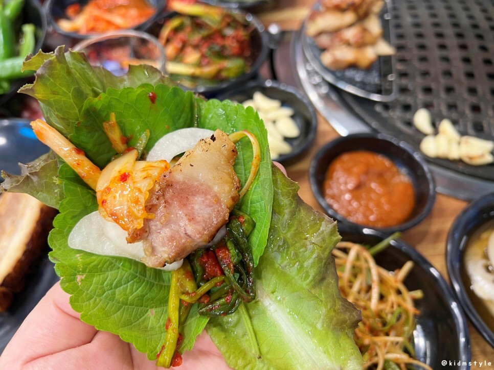 상추, 깻잎 등을 올리고 한 쌈 싸본다. 고기는 맛이 괜찮다. 가격이 저렴한데 적당히 맛있게 먹을만하니 손님이 많은 것 같다. 요즘 이런 체인이 많아지니 지갑이 얇은 나 같은 서민들의 입장에서는 반가운 일이 아닐 수가 없다.