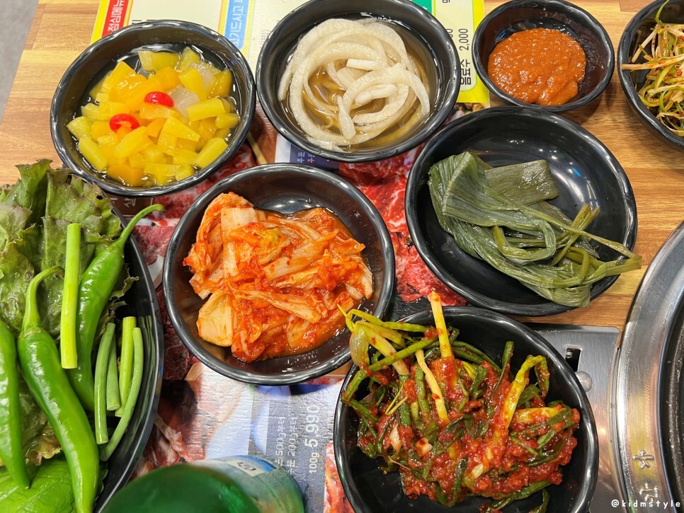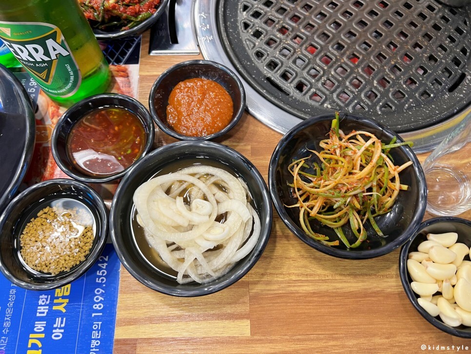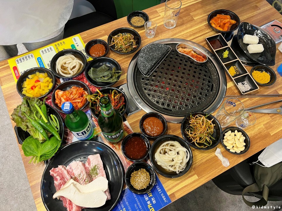 전부 차려진 모습이다. 상차림비를 받을 만큼 잘 나오는 건 아닌데 삼겹살 가격이 워낙 저렴하다 보니 수긍이 간다. 동방축산 다른 매장에서도 맛본 적이 있는데 기본 구성은 조금씩 다르더라.
