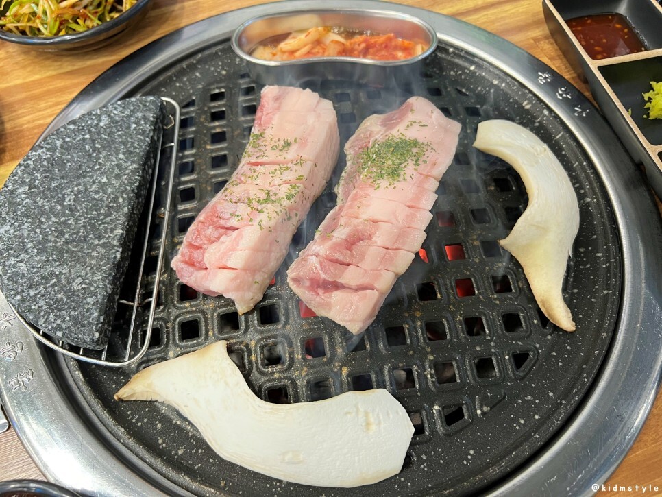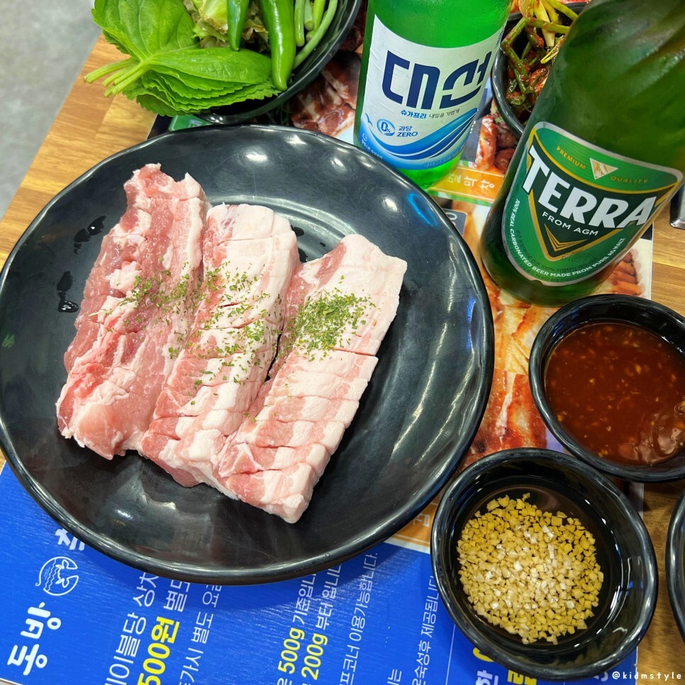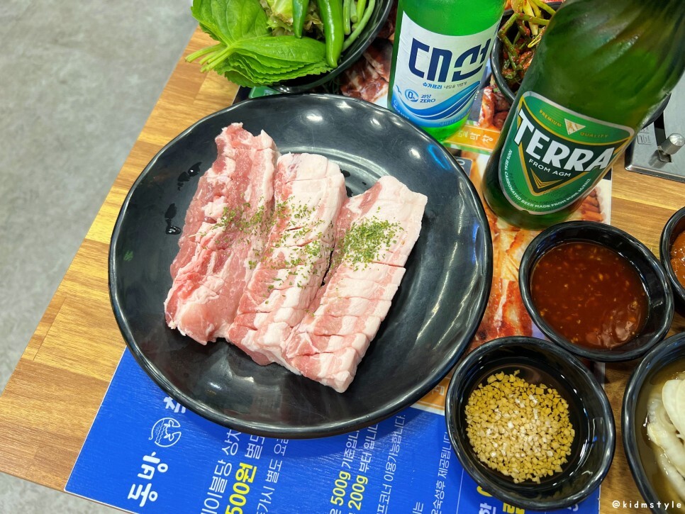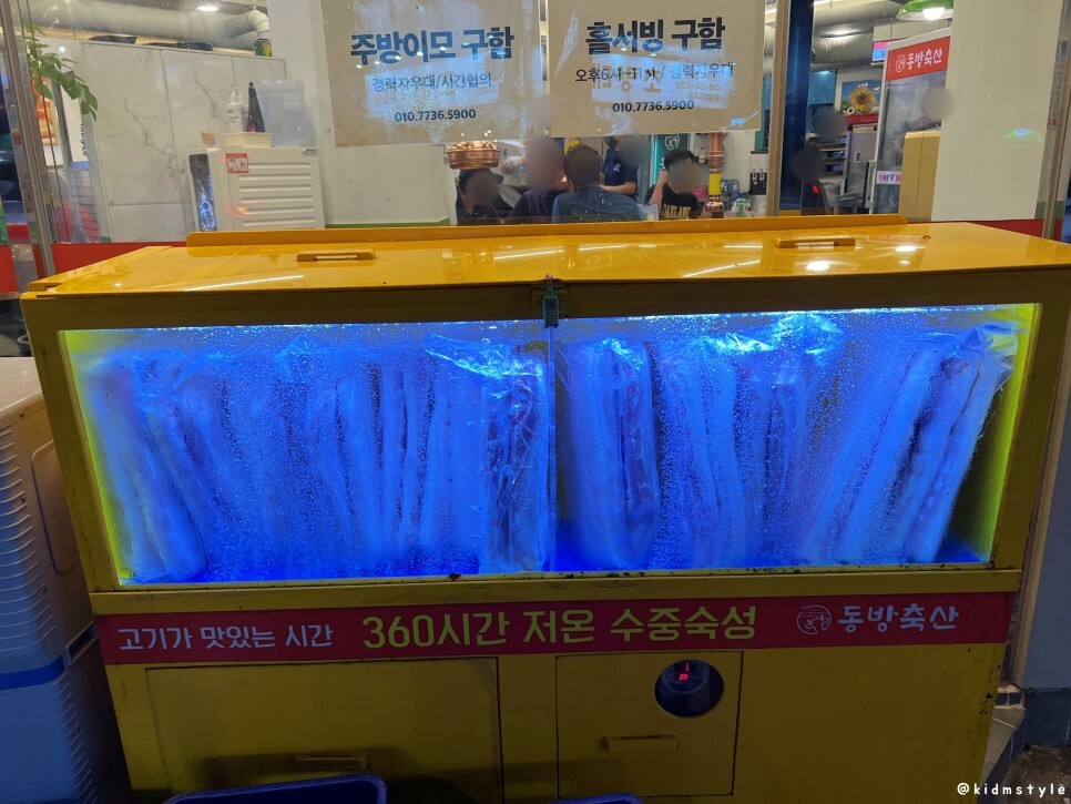 동방축산은 서면에서 영업을 처음 한 식당인데 장사가 잘 되었는지 프랜차이즈로 진출하더라. 삼겹살을 360시간 저온 수중숙성 시켜서 제공하는 게 이 집의 특징이다.