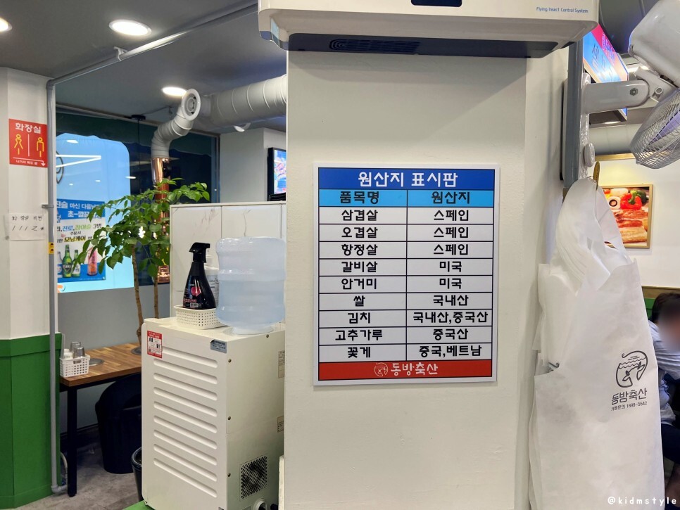 원산지 표시판이다. 삼겹살은 스페인산이다. 기둥에 1회용 앞치마가 걸려 있으니 필요시 사용하면 되겠다. 참고로 화장실은 나가서 오른쪽 건물 1층에 있다.