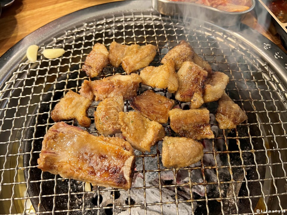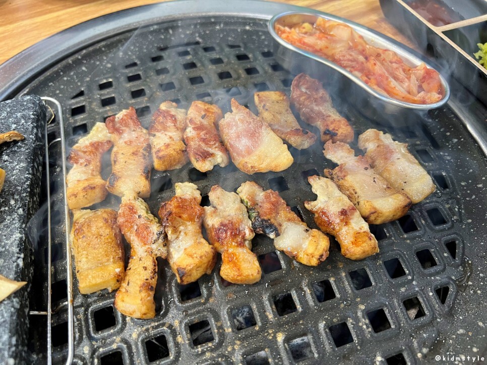 돼지갈비를 주문하면 불판이 바뀌는데 화력이 세기 때문에 잘 구워야 한다. 잠시 한눈팔면 다 태울 수도 있다.
