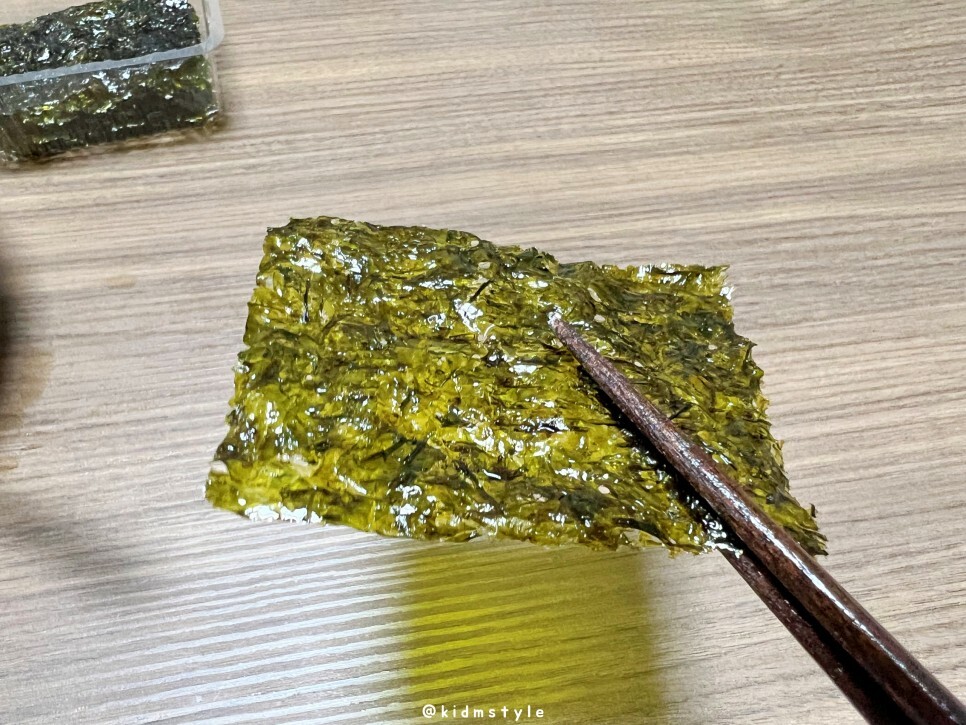 큰 기대를 하지 않고 김을 맛보았는데 생각보다 너무 괜찮다. 저렴한 가격이라고 얕보면 안 된다. 김이 짜지도 않고 싱겁지도 않은 딱 적당한 맛이라 호불호가 덜 갈릴 것 같고 두께도 두껍지 않은 적당히 얇은 김이며 바삭바삭해서 맛이 좋다.