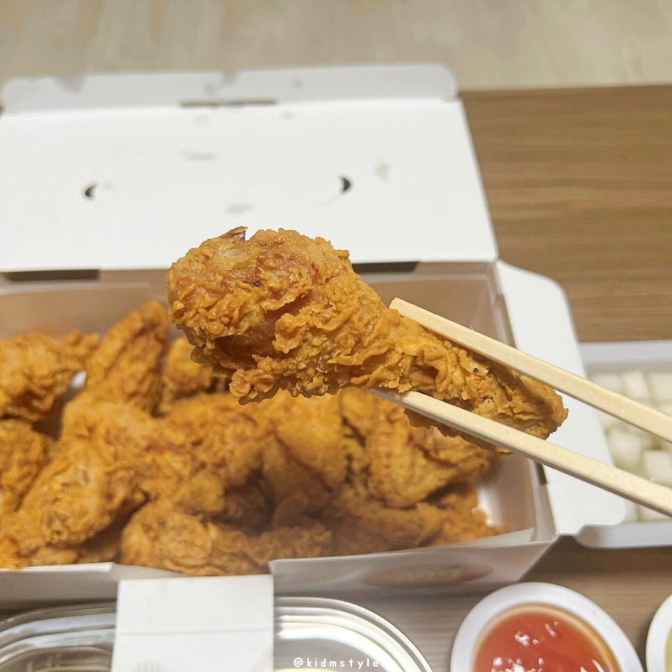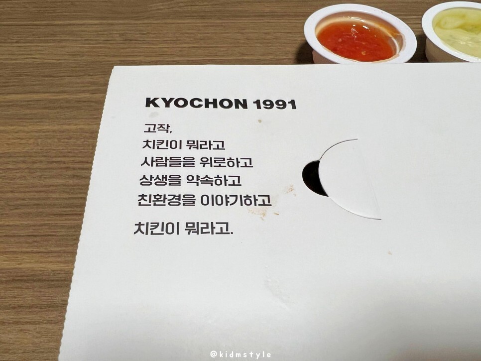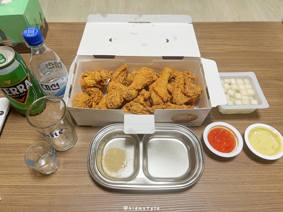 박스도 꽤 세련되게 바뀌었네. 치킨무, 스위트칠리소스, 하바네로마요소스, 겉보리소금 등 소스도 함께 왔는데 전부 기본 제공은 아니고 아마 동생이 추가 주문한 것 같다. 교촌을 먹어본 지 꽤 오래돼서 잘 모르겠네.