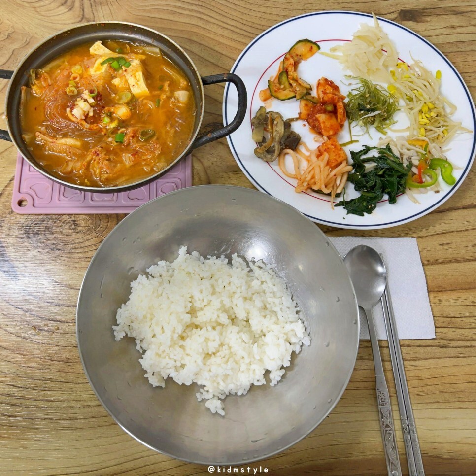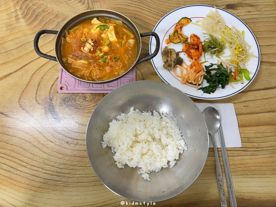 김치찌개, 9가지 반찬, 그리고 스테인리스 국그릇에 밥을 담아준다. 비벼 먹어도 되고 각각 먹어도 된다.