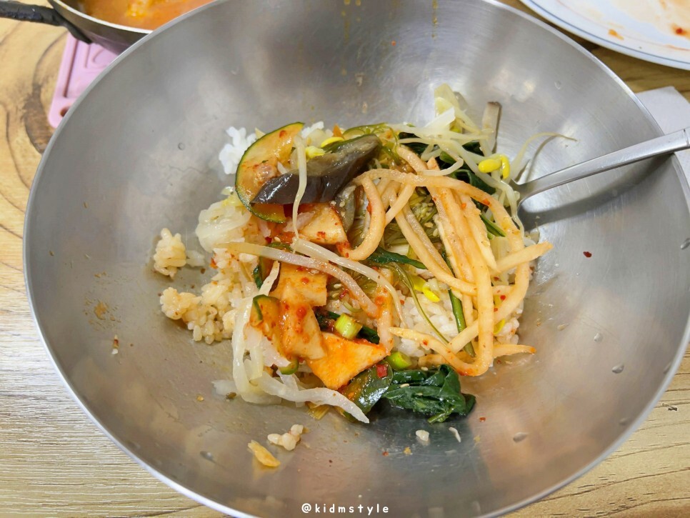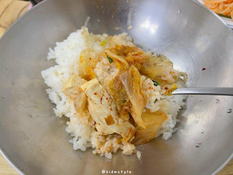 시원한 국물도 끼얹고 김치와 두부도 올리고 슥슥 비벼서 한 숟가락 하면 입이 참 즐겁다. 우와~ 진짜 엄청나게 맛있다! 정도는 아니지만 가격 대비 참 괜찮다고 본다. 그러니 점심때마다 손님이 박 터진다.