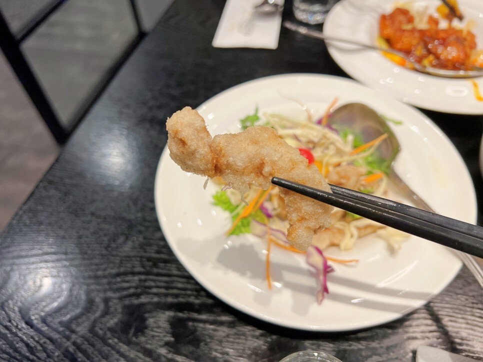 칠리 중새우가 나왔습니다. 코스가 하나씩 나오니 젓가락이 바빠지는데요. 매콤 달달한 소스의 향기가 후각을 자극하네요.
