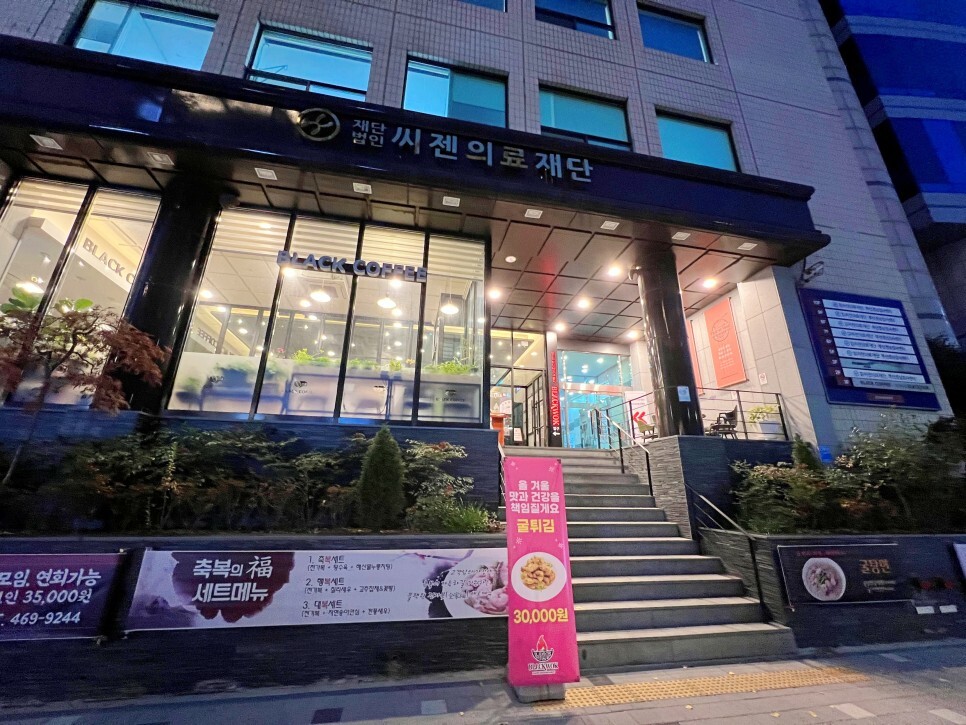 씨젠의료재단이 있는 건물 1층입니다. 외부에 다양한 홍보 현수막과 배너가 눈에 들어오네요.