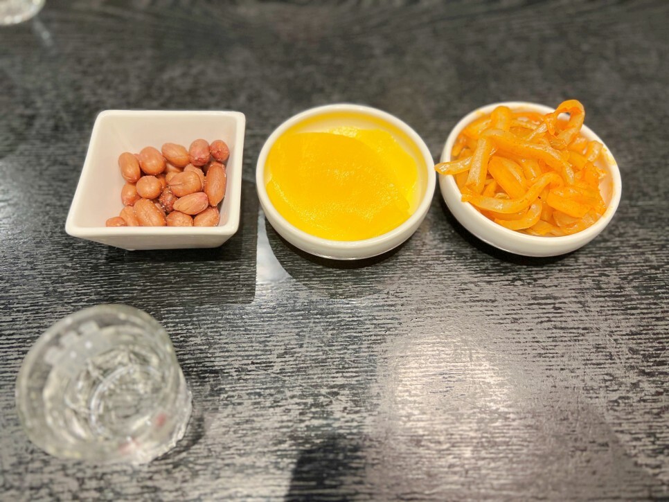 볶은 땅콩, 단무지, 짜차이 등 기본 반찬이 제공되고 이어서 코스 음식이 들어옵니다.