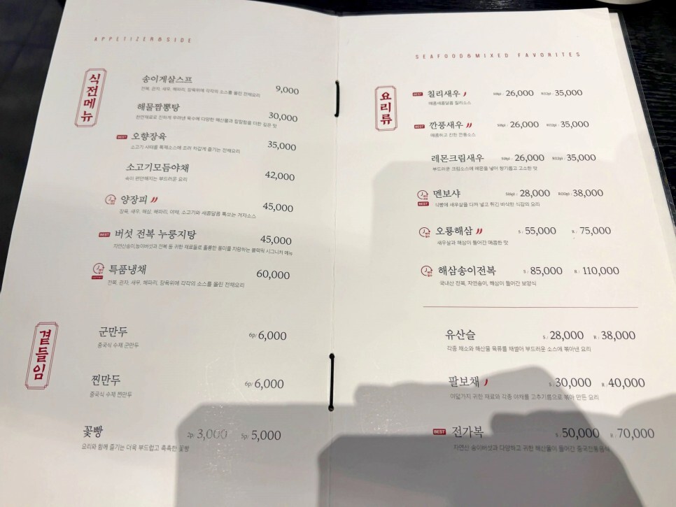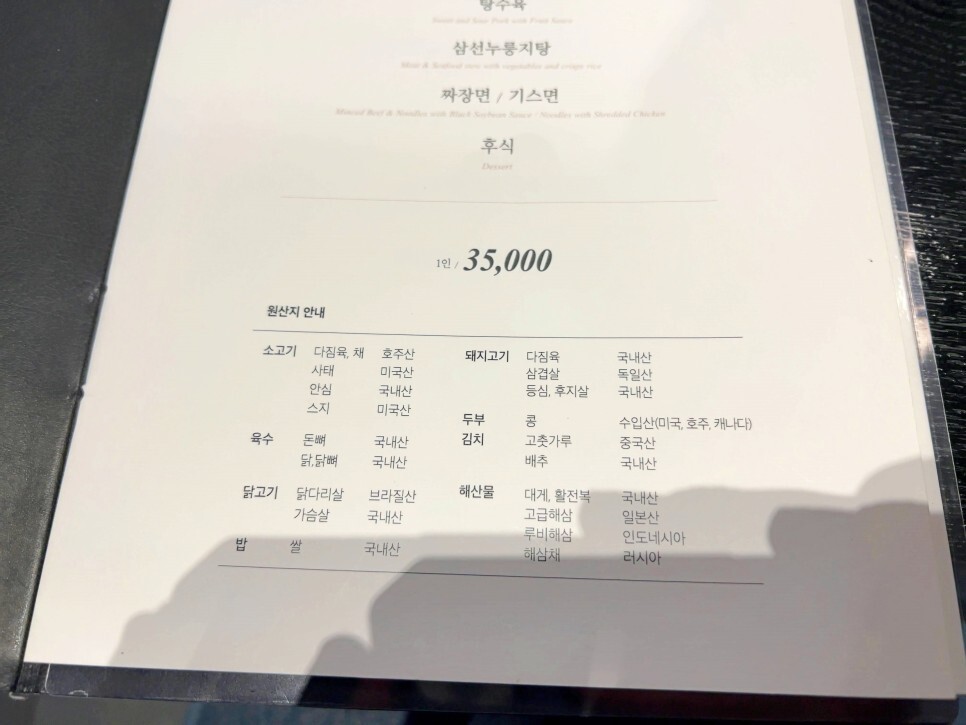 메뉴판에 원산지 표시 참고하시고요. 코스 메뉴를 맛볼 생각인데 가장 저렴한 1인당 35,000원짜리 블랙웍코스로 부탁드려봅니다.