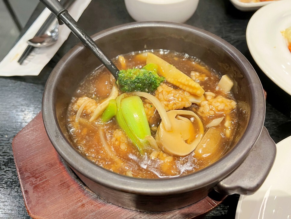 삼선 누룽지탕이 나왔네요. 코스의 끝이 보입니다. 청경채와 영콘, 양송이버섯, 그리고 누룽지가 뚝배기를 가득 채웁니다.