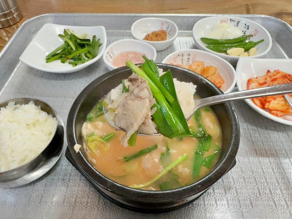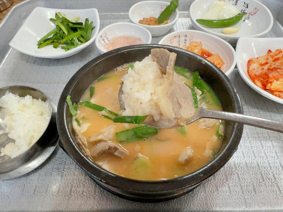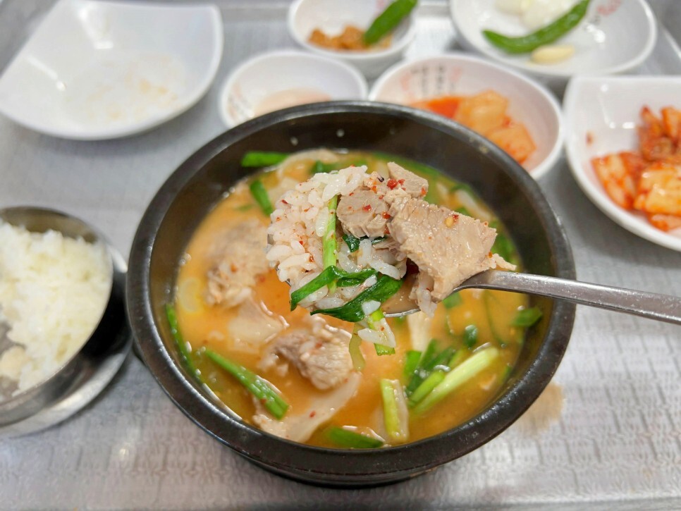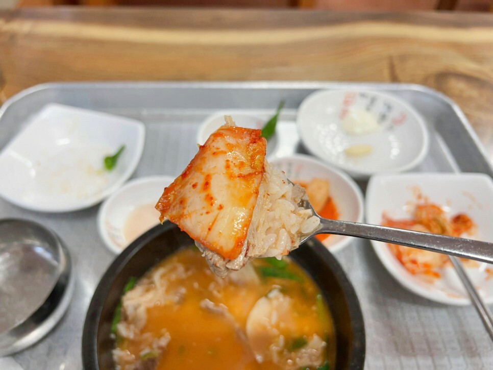 밥을 한 큰 술 떠서 국물에 푹 담갔다가 한입에 털어 넣습니다. 상당히 진하고 깊이가 있는 국물이라 자꾸 숟가락으로 떠먹게 됩니다.