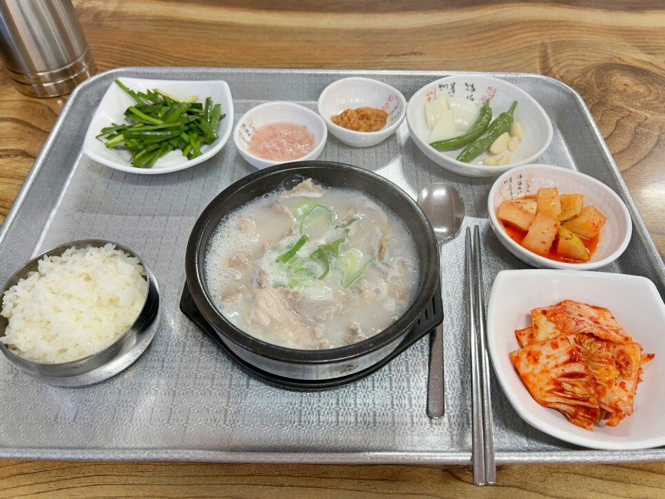 돼지국밥집에 혼자 가면 이런 트레이 째로 놓아주는 경우가 많습니다. 부추, 새우젓, 쌈장, 양파, 고추, 마늘, 깍두기 담을 접시, 김치, 그리고 공깃밥이 등장합니다. 국밥을 기다려보고요.