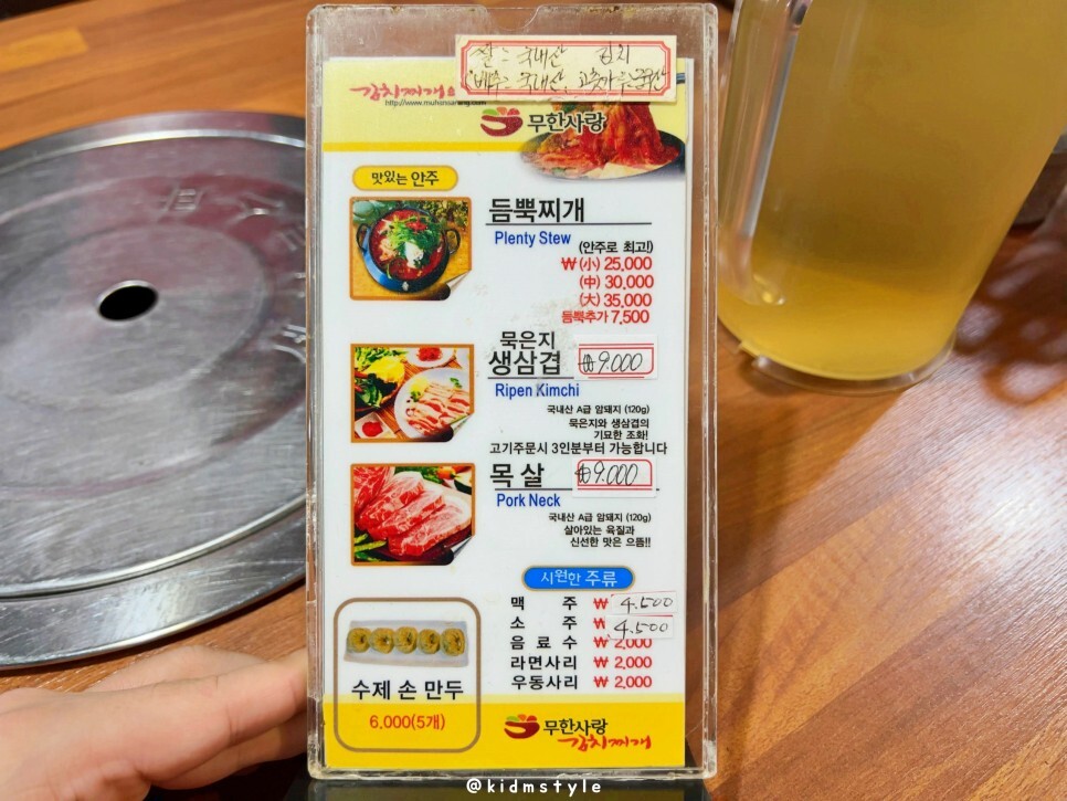 김치찌개의 명가, 무한사랑 김치찌개.생삼겹이라는 집인데 24시간 영업을 한다. 찾아보니 체인점인데 전국에 5군데 밖에 없다. 본점은 전주에 있다고 한다. 그래서 전주식 김치찌개 전문점이라고 소개하고 있다.