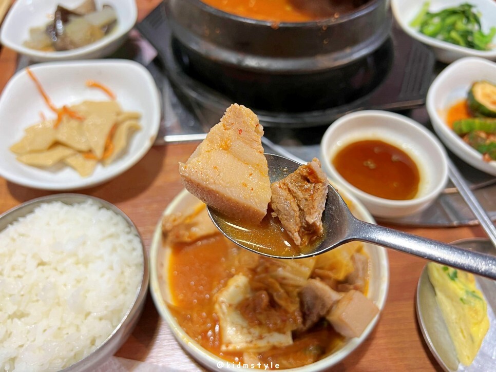 보기만 해도 푸짐하다. 맛을 보니 국물은 참 시원하고 재료들과의 조화가 좋다. 돼지고기는 통으로 들어가 있어서 큰 기대를 안 했는데 상당히 부드러우면서 잡내 하나 없고 퍽퍽함도 없다. 김치찌개에 정말 잘 어울리는 고기라고 말하고 싶다. 두부는 너무 부드럽지 않고 적당한 탄력이 있어서 딱 괜찮다.