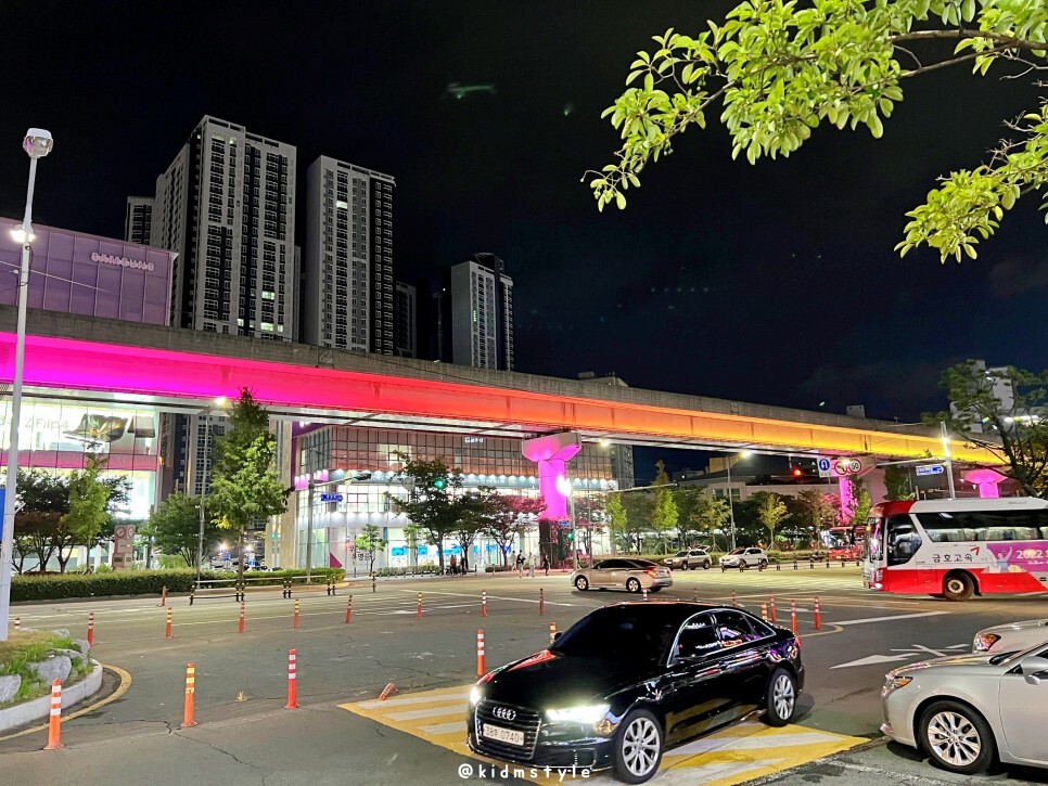 식사를 마치고 밖으로 나오니 어느덧 해는 저물고 부산 김해 경전철 교각은 예쁜 조명으로 물들었네.