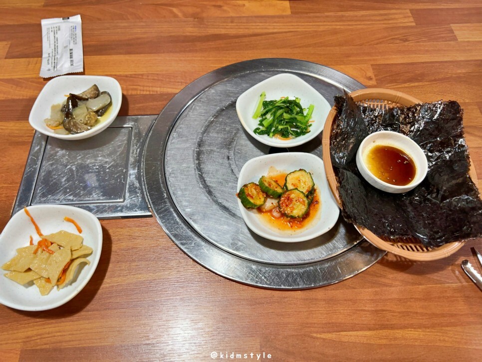반찬이 하나씩 깔리는데 가지볶음, 오뎅볶음, 오이무침, 열무나물, 김 등이 나온다. 전부 좋아하는 반찬이라 좋다.