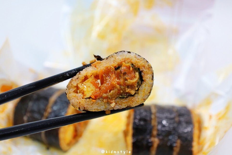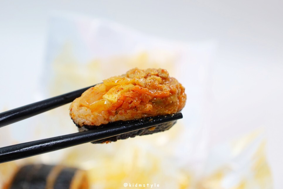 하나 집어서 맛본다. 김밥 속이 알차다. 매콤이라길래 많이 매울 줄 알았는데 별로 안 맵다.