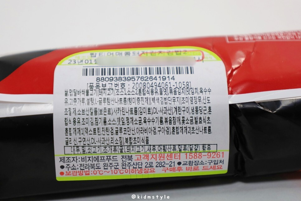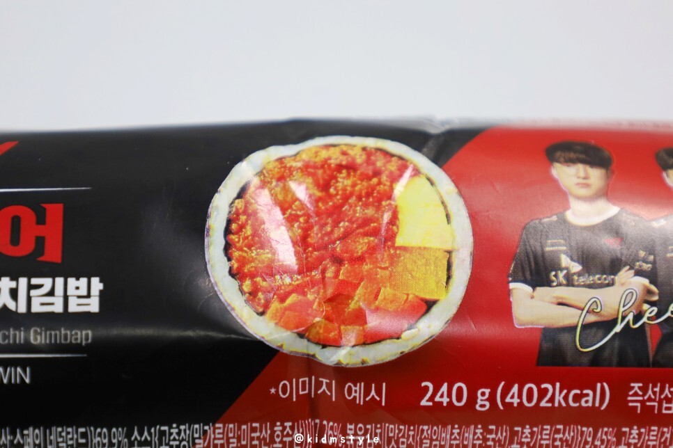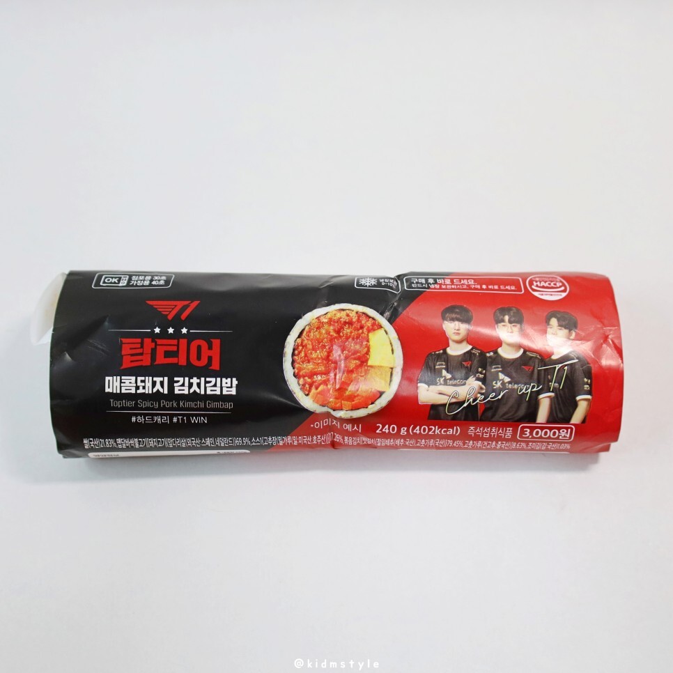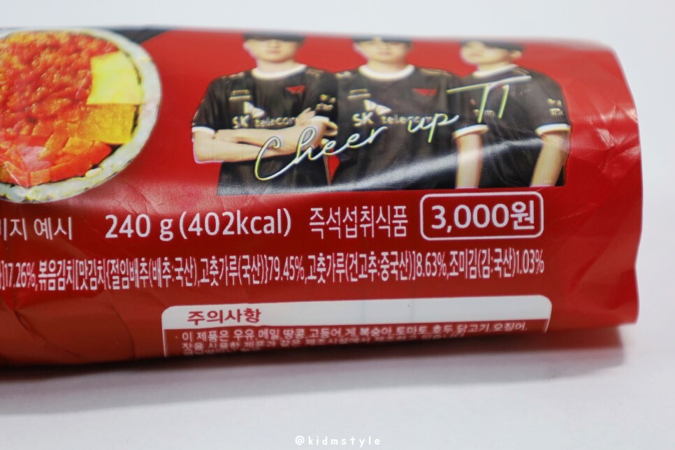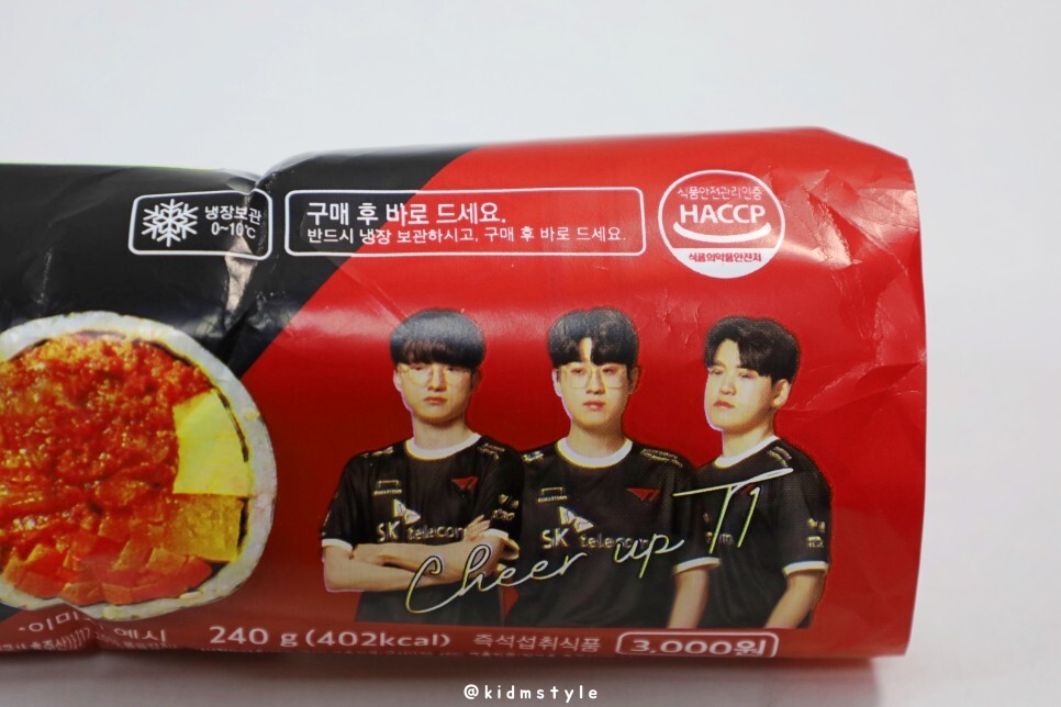 냉장 보관 제품이며 HACCP 인증 업체에서 생산한 김밥이다. 롤 게임의 팀인 T1 멤버들의 사진이 있다.