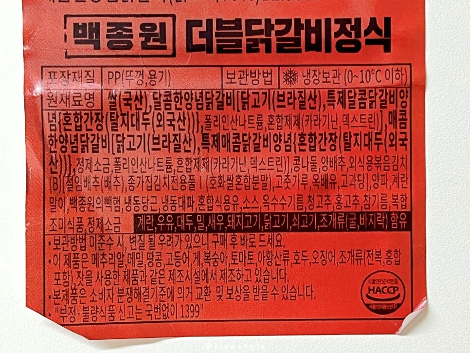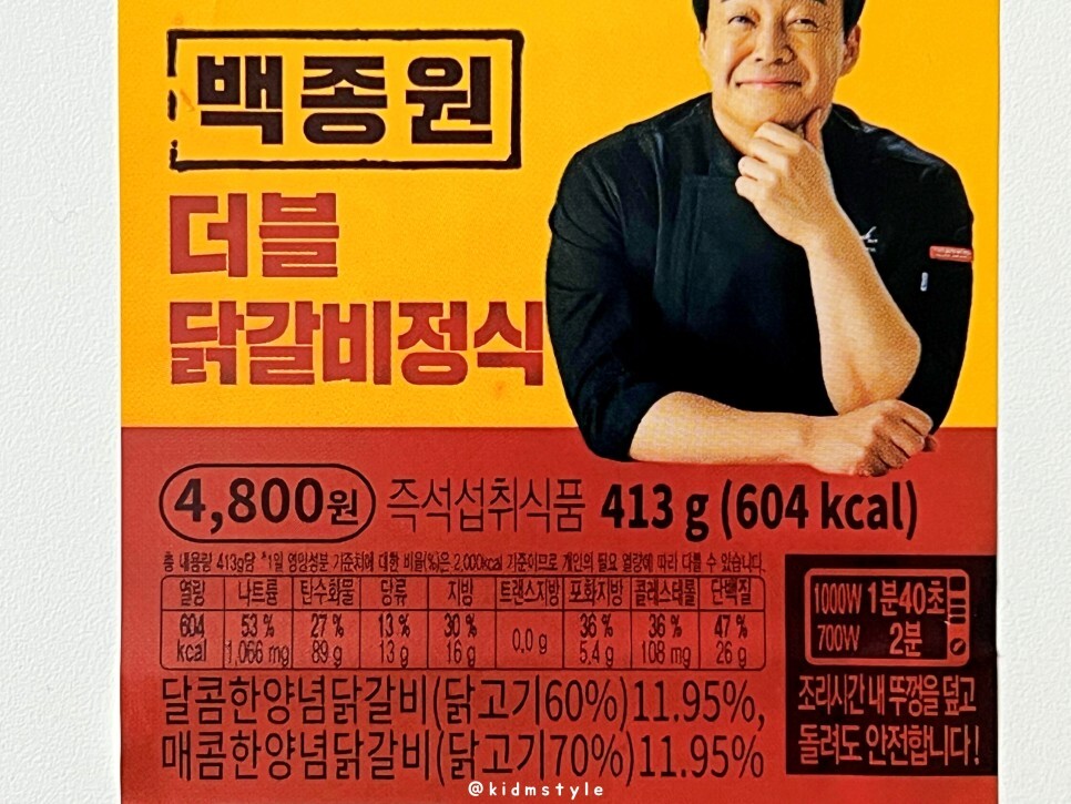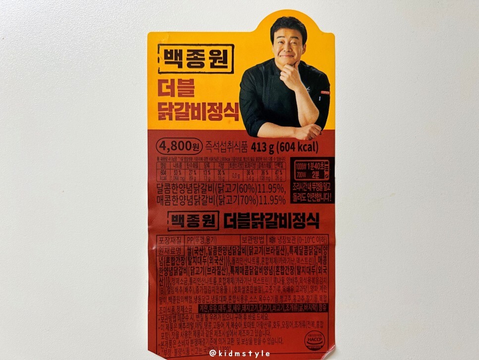 가격은 4,800원이며 413g 604kcal이다. CU 백종원 더블 닭갈비정식 영양성분 정보 참고