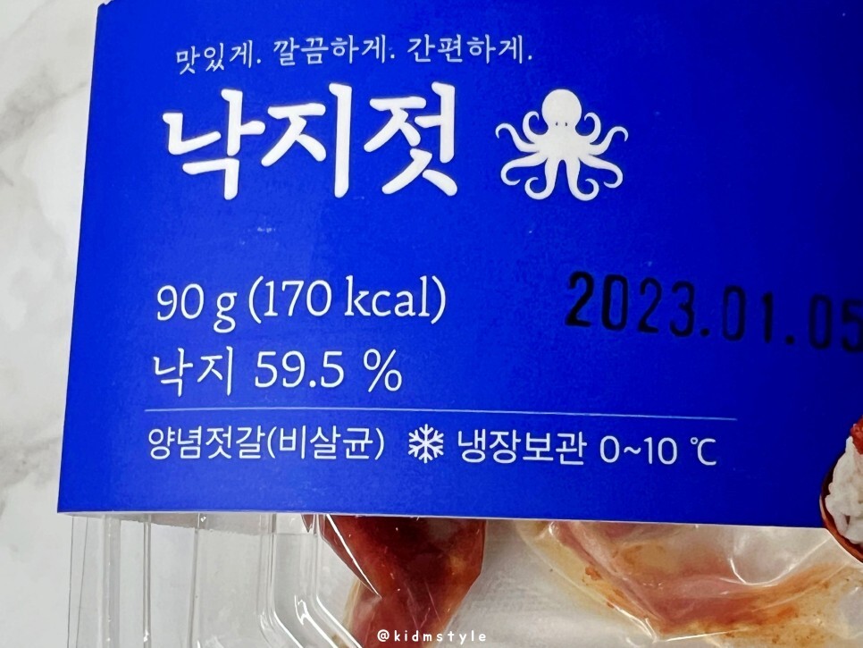맛있게 깔끔하게 간편하게 낙지젓 90g에 170kcal이다. 비살균 양념젓갈이며 냉장 보관을 해야 한다.