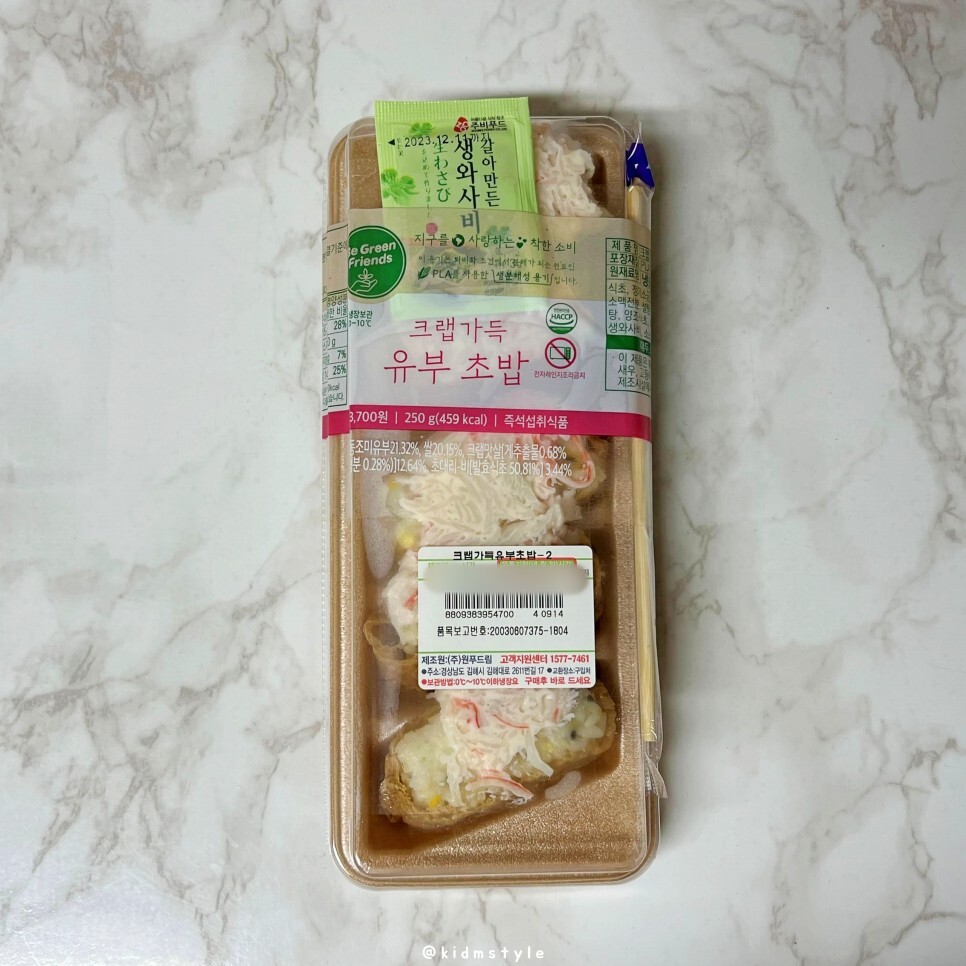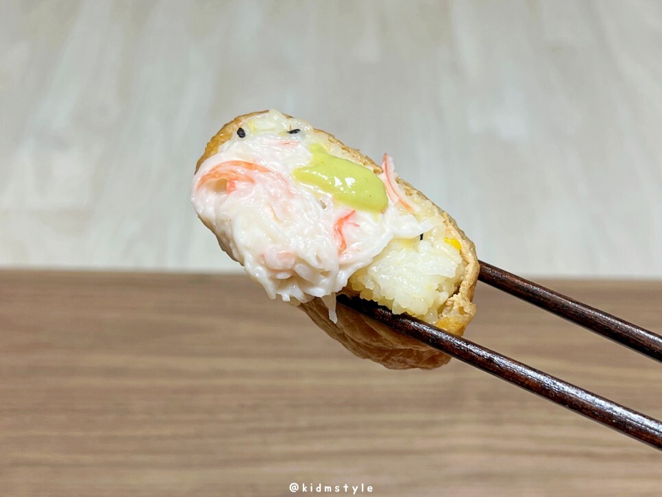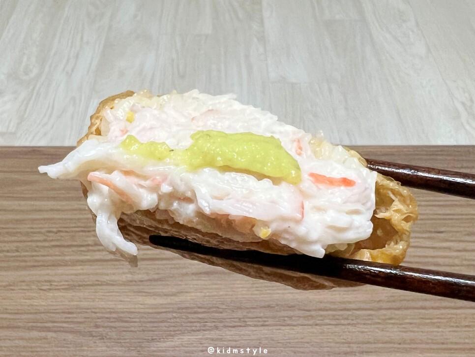 CU 편의점에서 구입할 수 있는 크랩가득 유부초밥이다. 젓가락은 옆에 붙어있고 특이하게 생와사비를 제공한다.