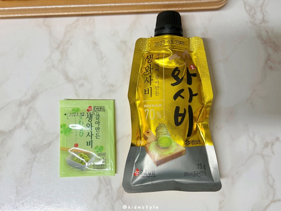 냉장고에 보관하고 있던 주비푸드의 생와사비가 있어서 꺼내보았다. 평소 즐겨먹는 제품이라 반갑네. 오른쪽 생와사비는 7,000원 대에 마트에서 구입할 수 있다.