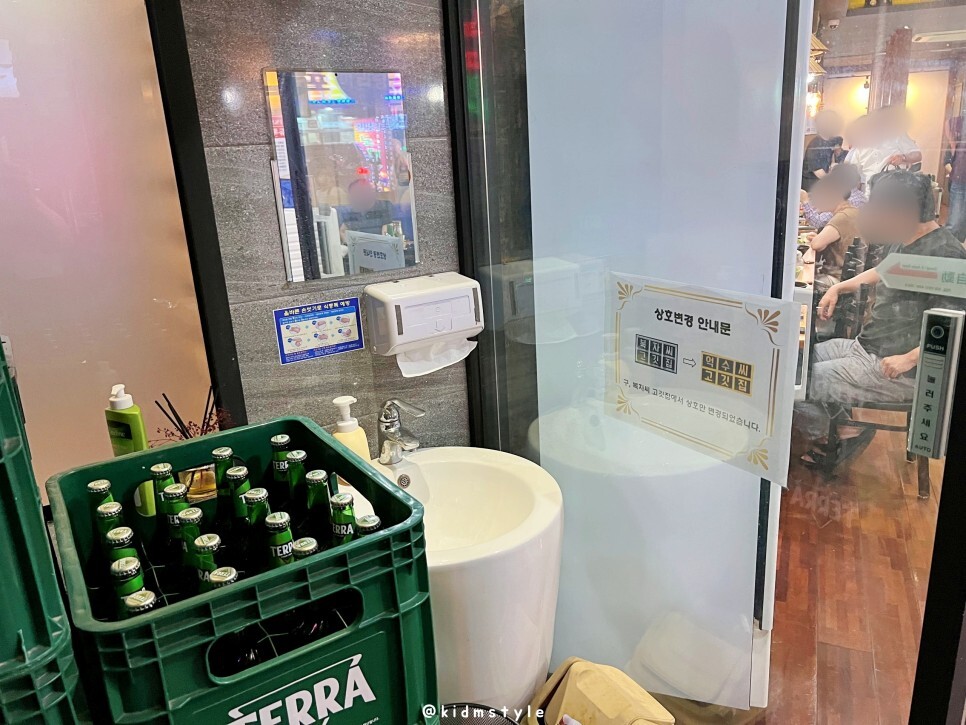 입구 왼쪽에는 간단하게 손을 씻을 수 있는 세면대가 놓여 있다.