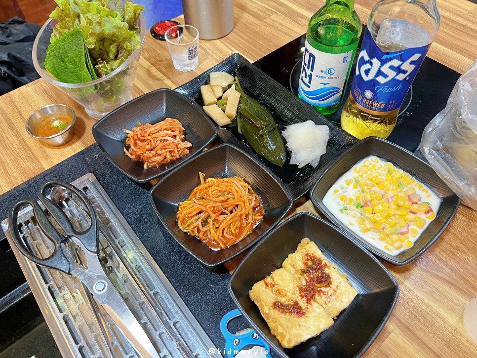 반찬이 다양하게 나온다. 명이나물, 콘 샐러드, 무생채, 콩나물찜, 두부구이까지. 상추, 깻잎 쌈과 젓갈, 그리고 소맥을 위해 소주, 맥주도 준비한다.