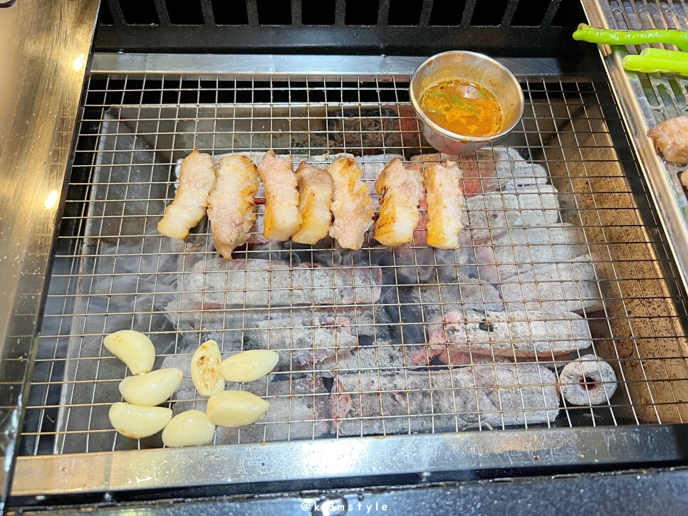 두툼한 고기라 마음에 든다. 불이 상당히 좋아서 집게 마스터가 아니면 굽기가 힘들다. 그래서 직접 굽는다고 했을 때 직원분들이 엄청 유심히 주시한다. 물론 좀 굽는 걸 보고 나서 더 이상 신경을 안 쓰더라.