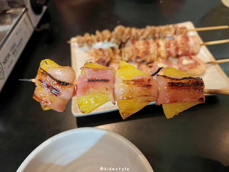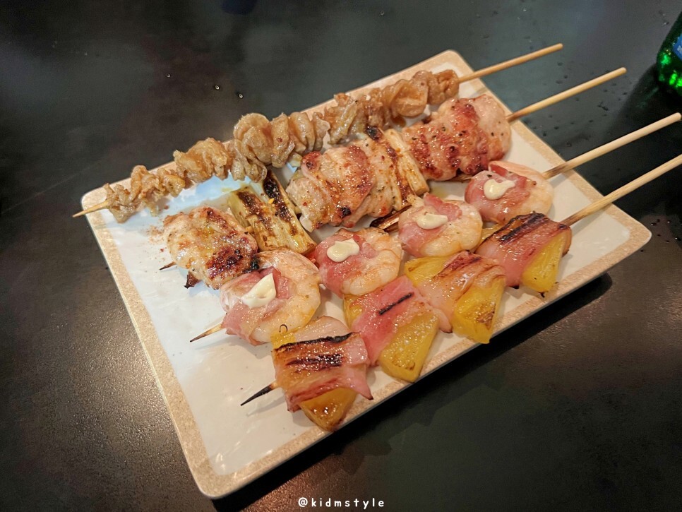 닭껍질구이, 닭다리살파구이, 새우베이컨말이, 파인애플베이컨말이 순이다.