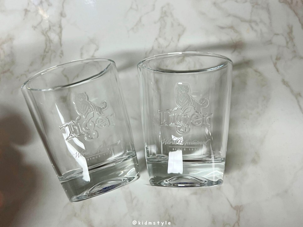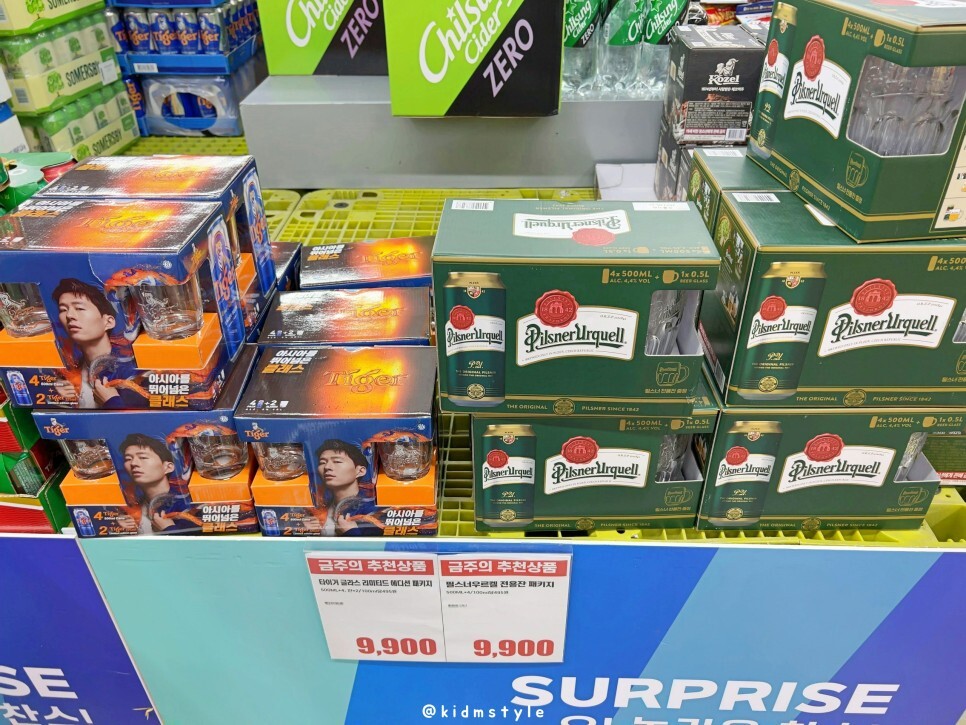 타이거 4캔에 9,600원인데 바로 옆 매대를 보니 4캔 + 작은 글라스 2개 해서 9,900원이다. 잔 2개에 300원이니 당연히 이걸로 하나사본다. 옆에 필스너우르켈 패키지도 구입하고.