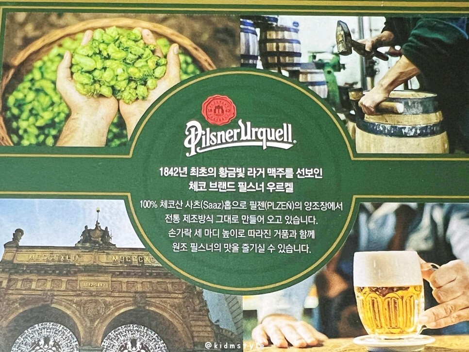 필스너우르켈은 1842년 체코에서 시작한 맥주이다. 역사가 상당히 오래됐는데 꽤 맛있는 라거라서 마니아들이 많다. 본 블로거 역시 좋아하는 맥주이다. 거품을 손가락 세 마디 높이로 따라서 맛보는 게 포인트이다.