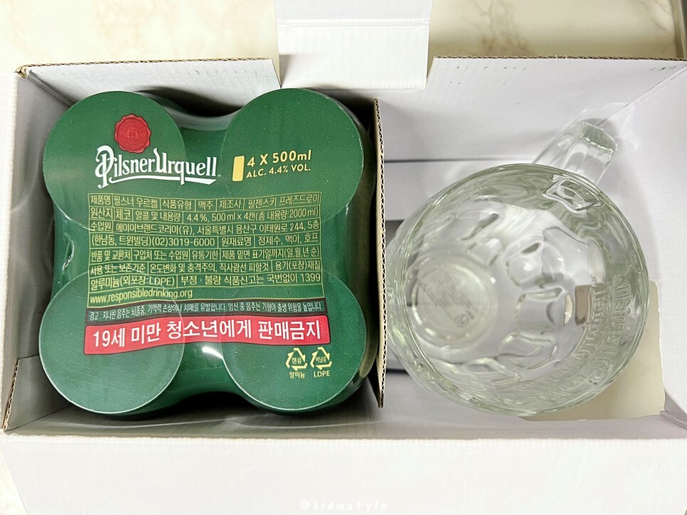 필스너우르켈 500ml 4캔, 500ml 전용잔의 구성이 9,900원이다.