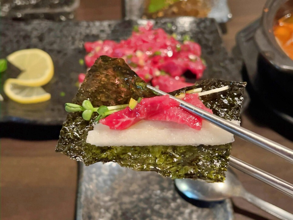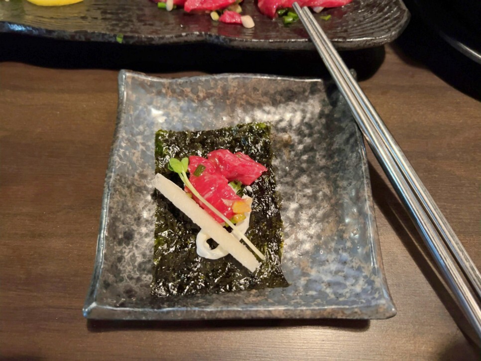 김은 따로 요청을 해서 제공받았답니다. 김에 싸 먹으면 정말 맛있거든요. 앞접시에 김 올리고 재료를 하나하나 올립니다. 그리고 입으로 직행, 완행은 없습니다. 직행입니다. 맛있네요.
