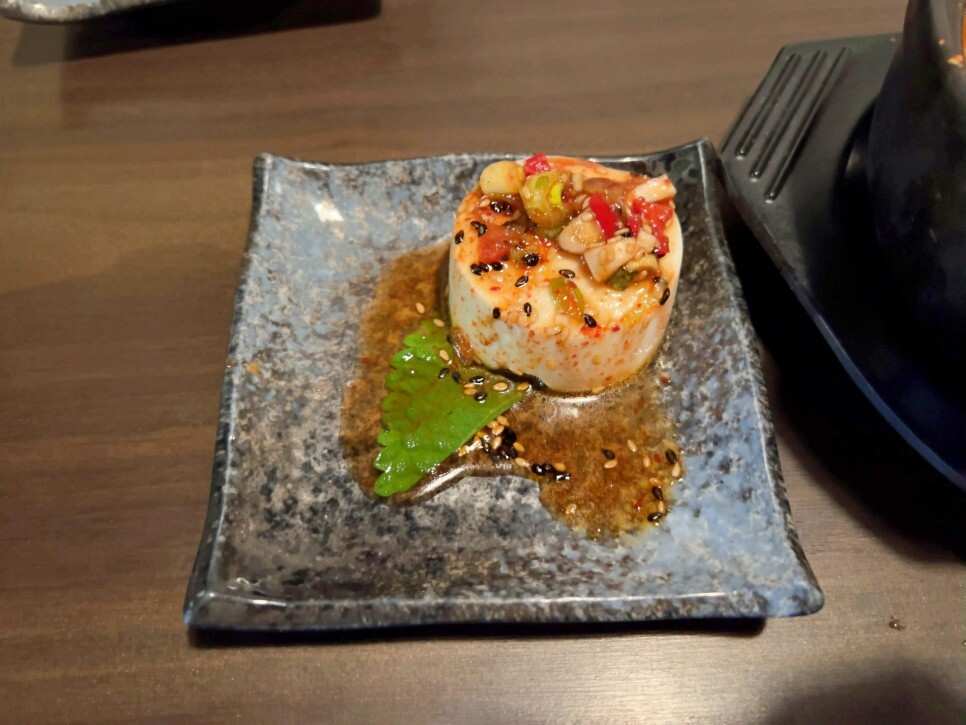 입맛을 돋우는 양념이 듬뿍 올라간 순두부가 반찬으로 제공됩니다. 양념이 과하지 않고 편안하게 먹을 수 있어서 참 좋아요.