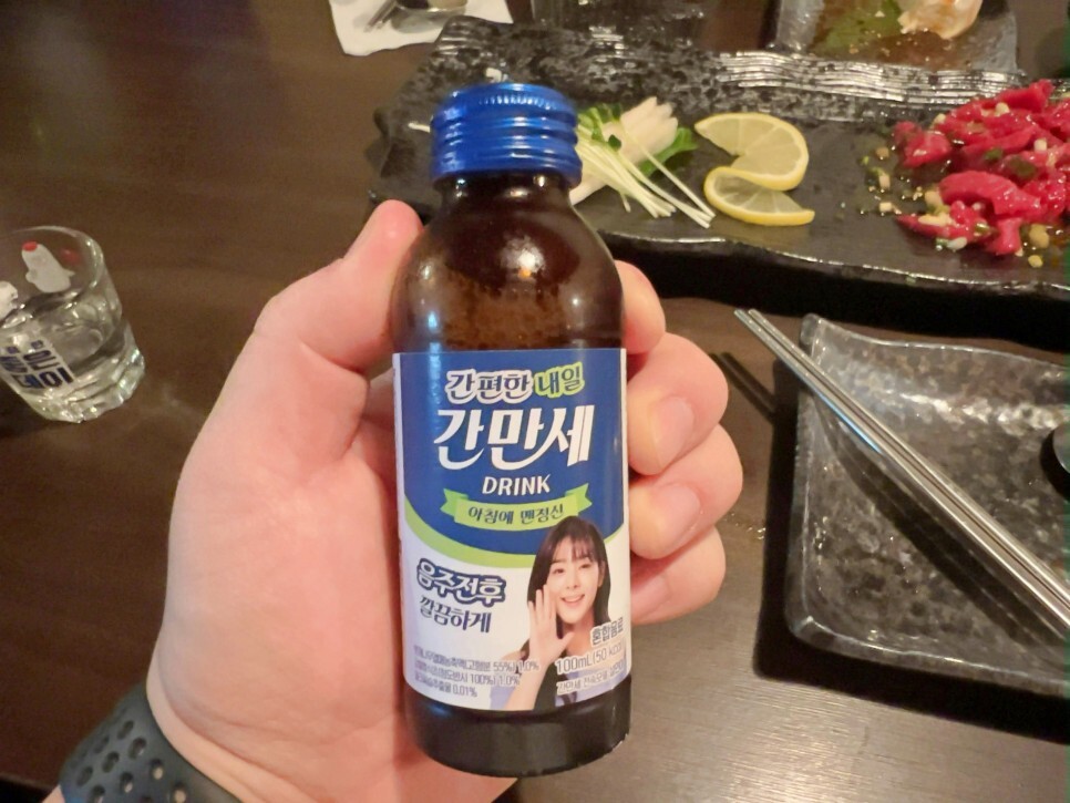 소주회사 판촉 직원들이 나눠주고 간 숙취해소제는 사진 찍고 지금 바로 마셔봅니다. 깔끔한 내일 아침을 위해서 말이죠.