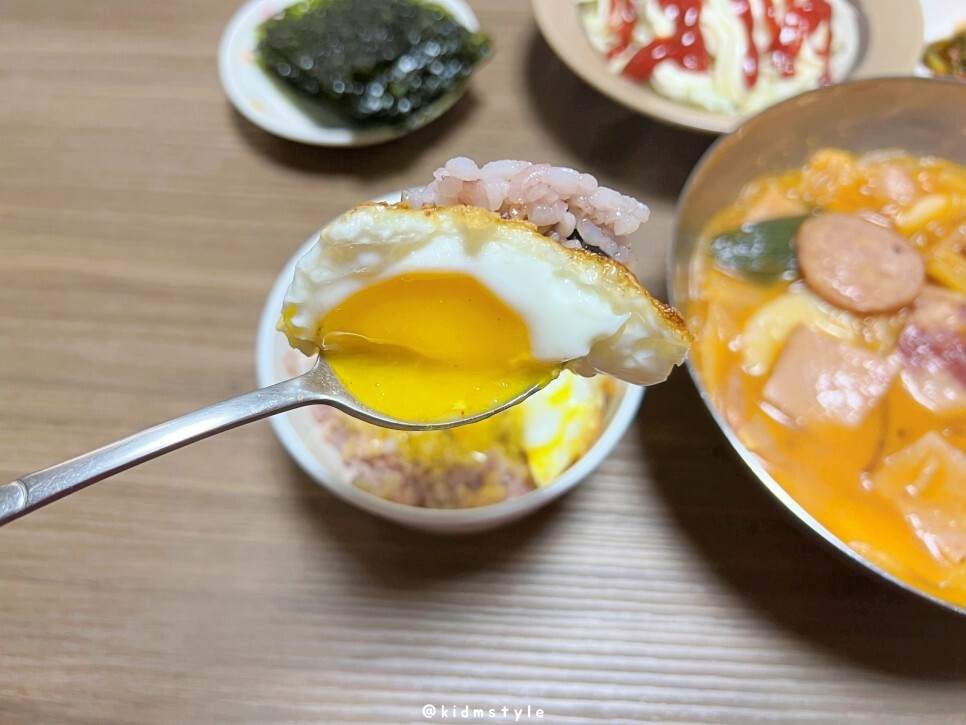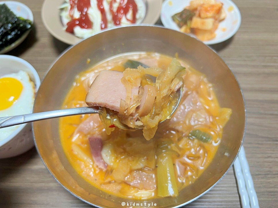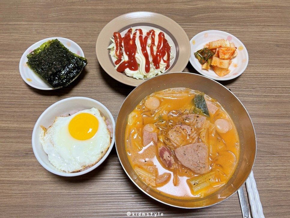 간단하게 차려보았다. 부대찌개에 빠지면 섭섭한 김, 후라이는 물론이고 냉장고에 있던 양배추 썰어서 케첩, 마요네즈 올리고 파김치와 열무김치까지 세팅하니 제법 밥상 같다.