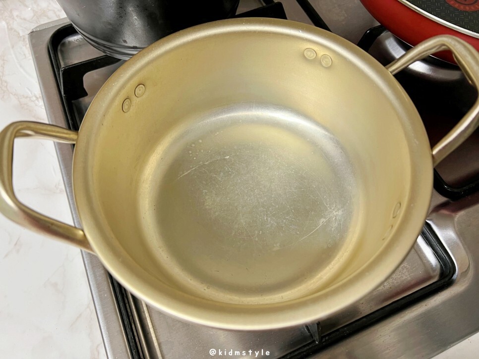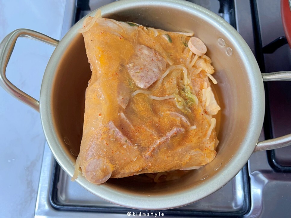 어떤 냄비에 끓일지 고민하다가 사이즈가 딱일 것 같아서 양은 냄비로 준비하였다. 왠지 부대찌개는 여기 끓이면 더 맛날 것 같다.